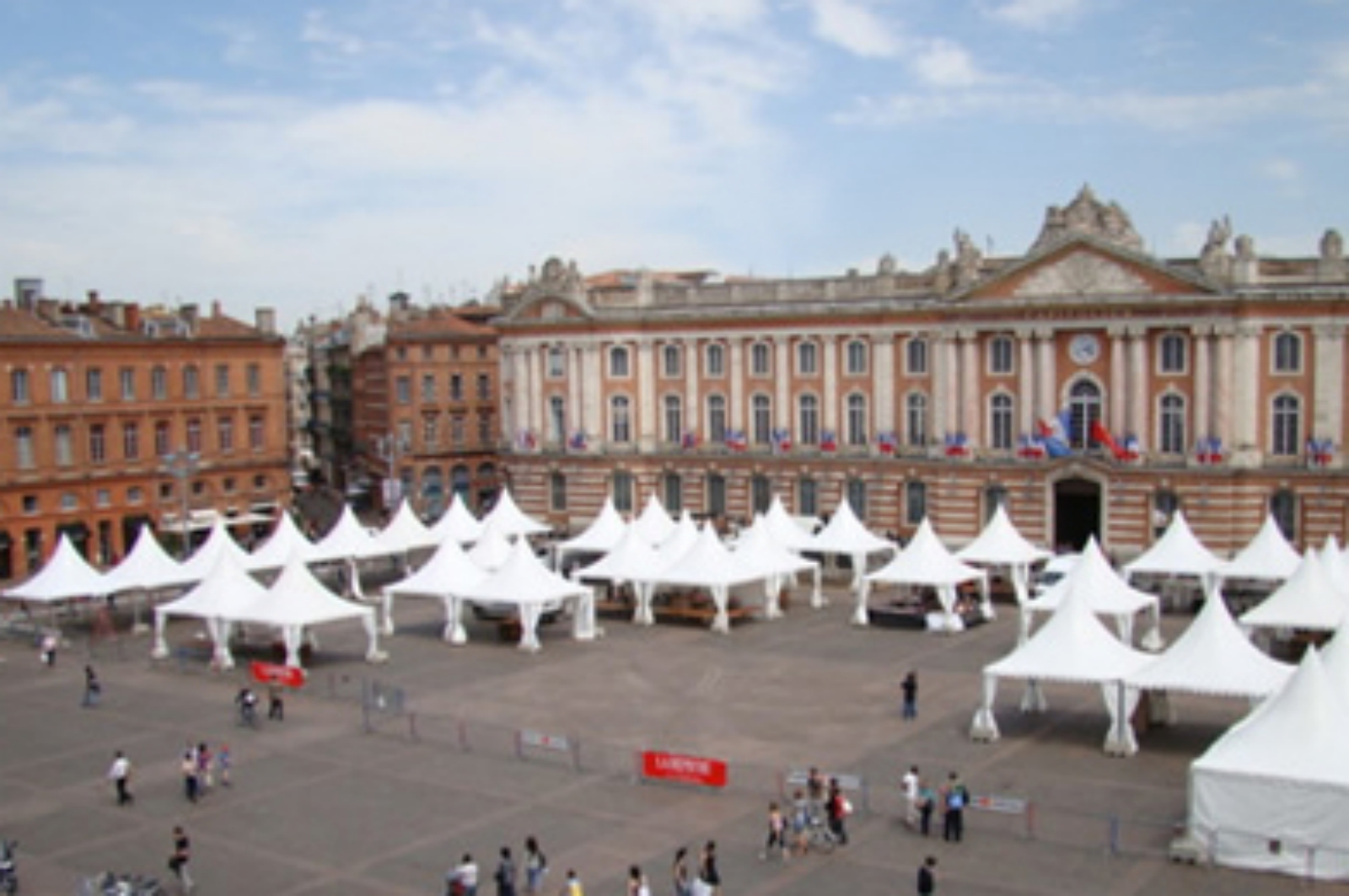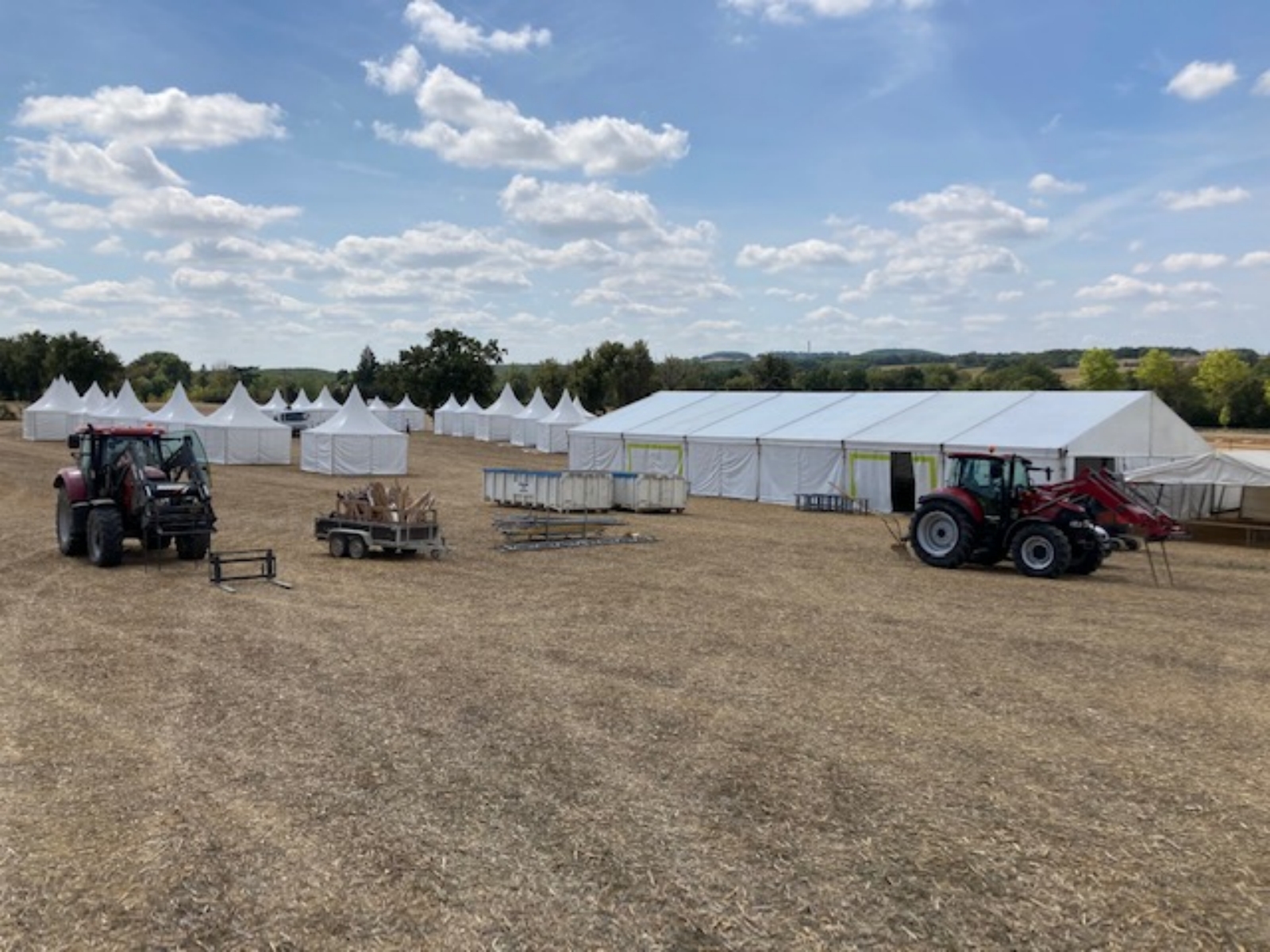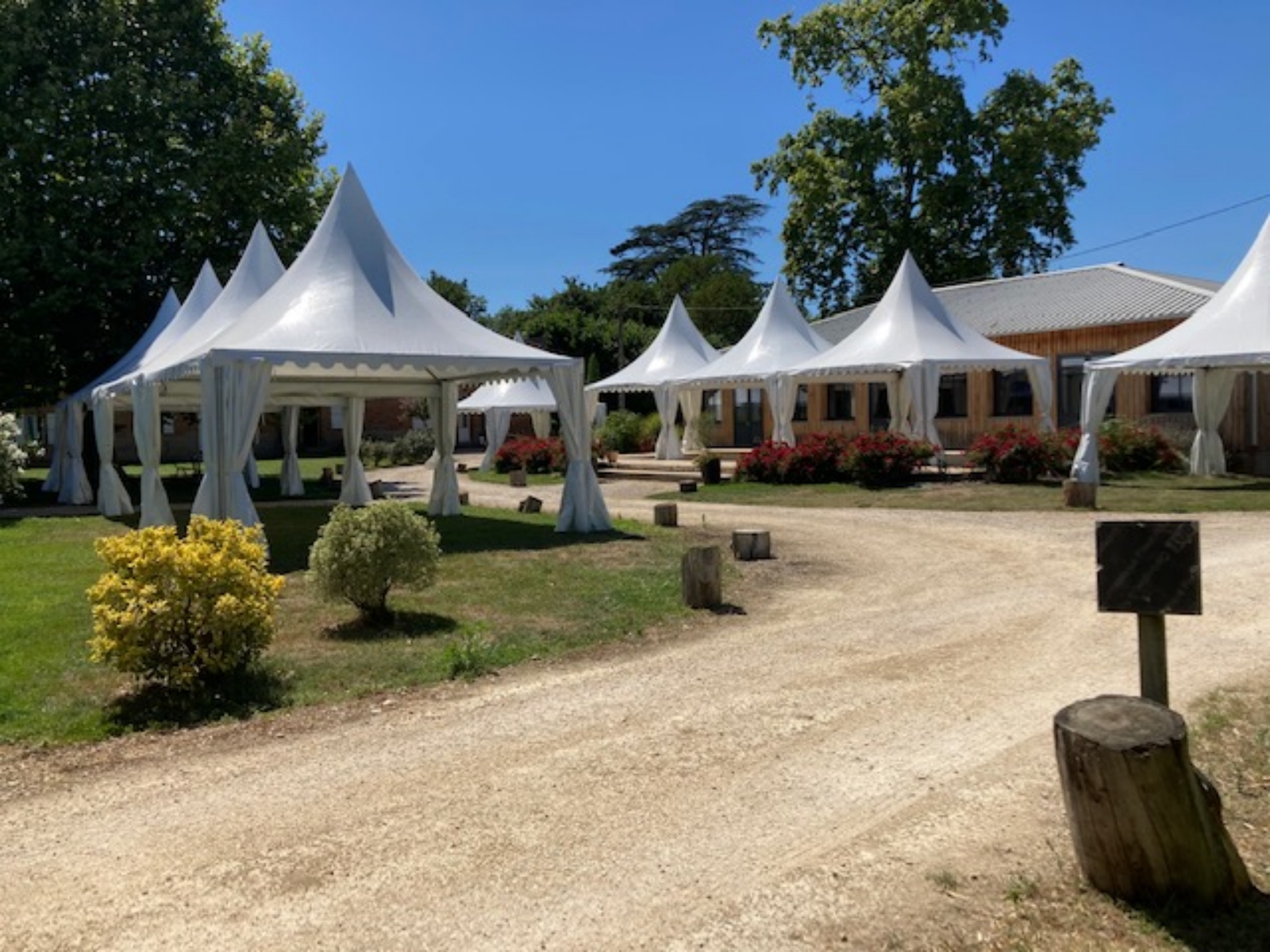 Les pagodes élégantes et fonctionnelles mises à disposition par les ateliers Algayres. Ces chapiteaux peuvent être configurés pour accueillir des scènes, des stands ou des espaces d’exposition.