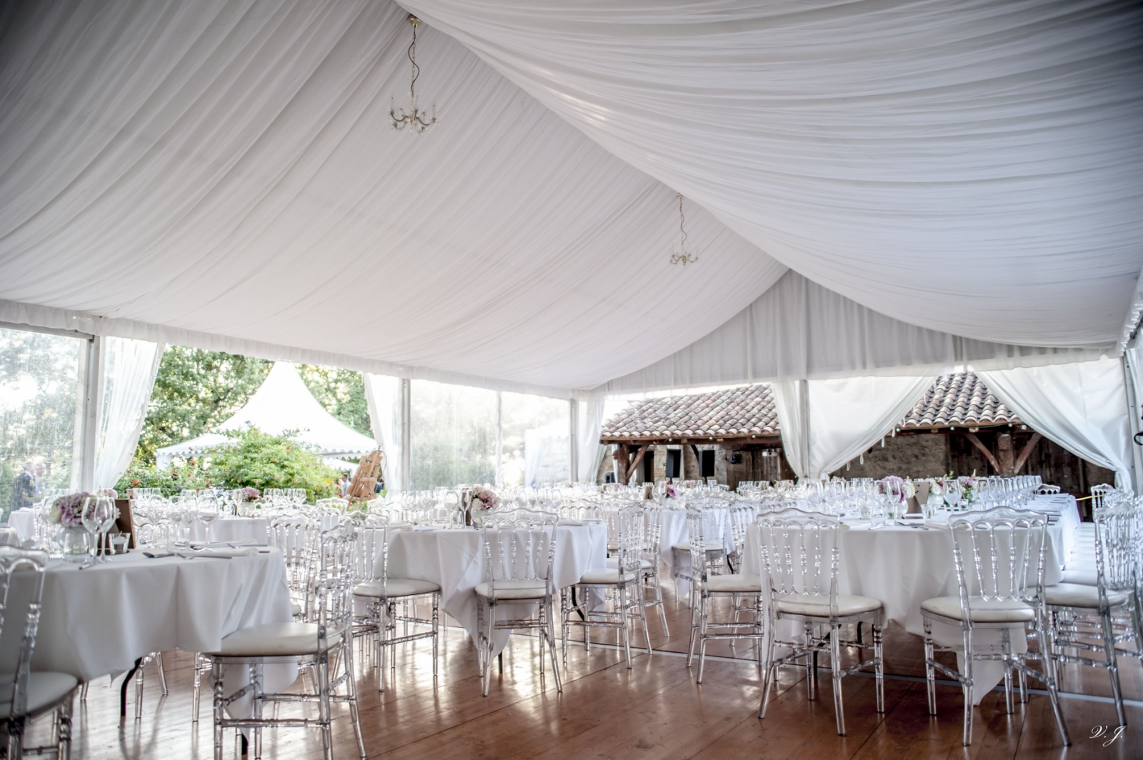 Chapiteau de 10x15m avec plancher autoporté, vélum, lustres et mobilier.